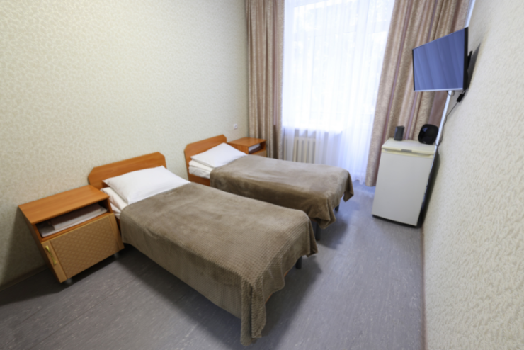 Оснащение номера: две односпальные кровати, прикроватные тумбы, стол, стулья, шкаф для одежды, телевизор, холодильник, электрочайник, бесплатный интернет Wi-Fi